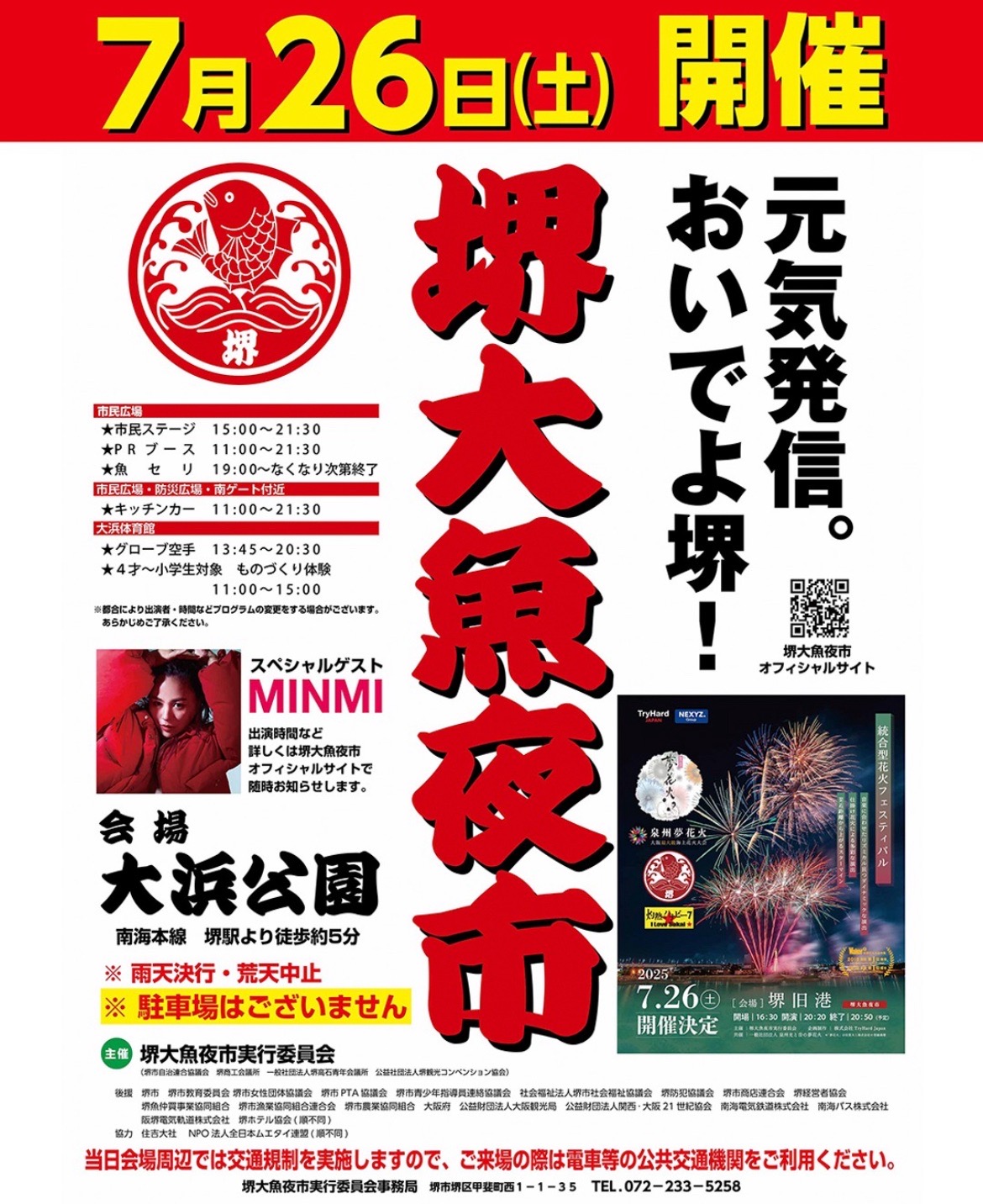 堺大魚夜市(さかいおおうおよいち)とは、大阪府堺市堺区にある大浜公園で毎年7月31日に行われる魚市、祭の事。に出演が決定しました。